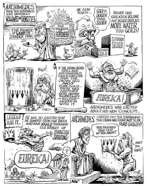 この問題を解決する方法をアルキメデスは入浴中に得たのです。彼は自分の体積分だけ水があふれるのを見て、ある方法に気づき、"Eureka!"(「わかったぞ!」)と叫び服を着るのも忘れて町に飛び出していきました。